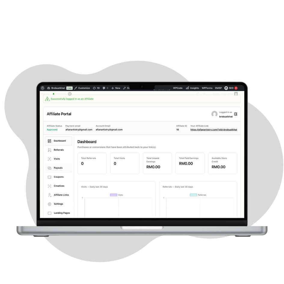 Semua info penting boleh akses dalam satu tempat – jualan, klik, komisen & payout. Tak payah teka-teka.