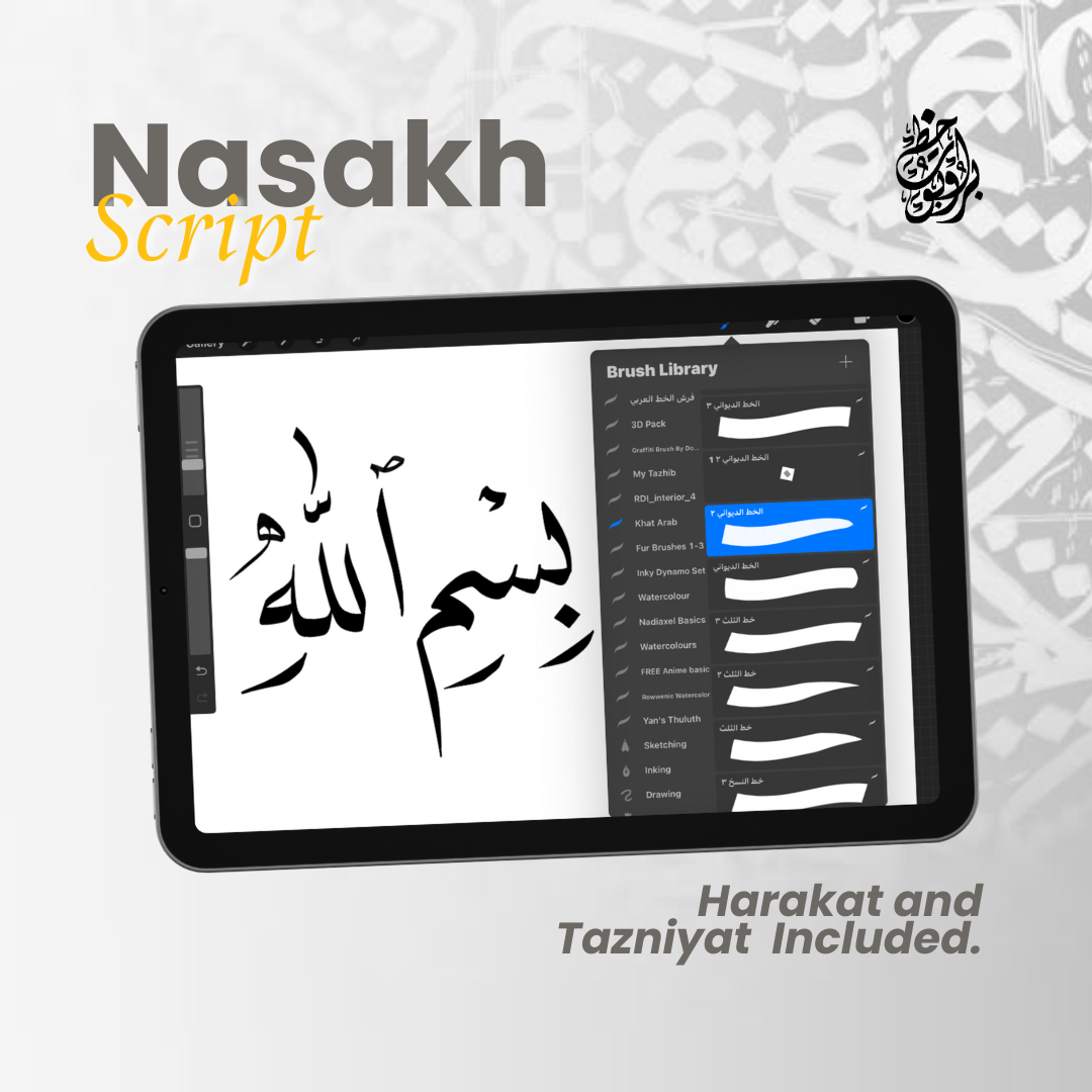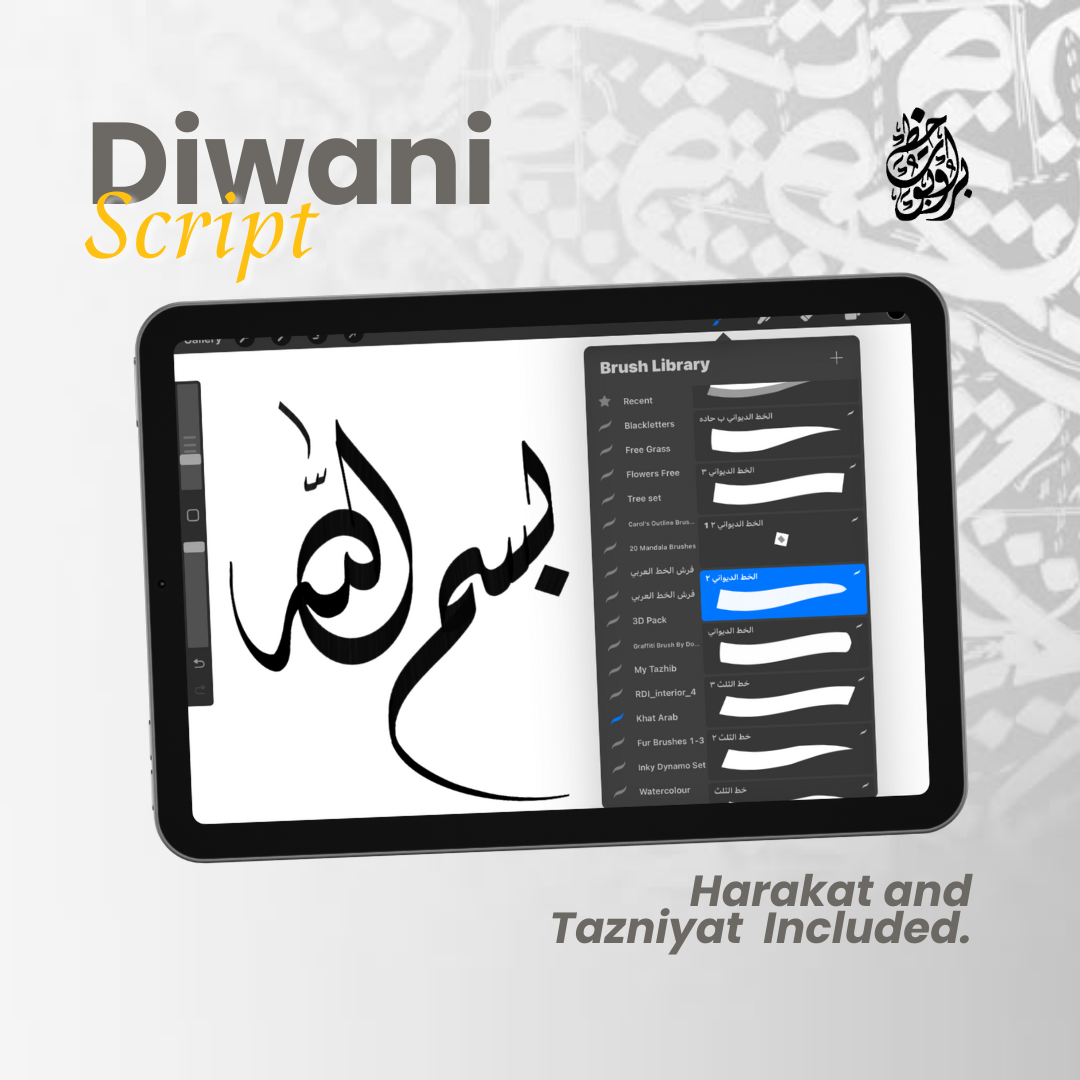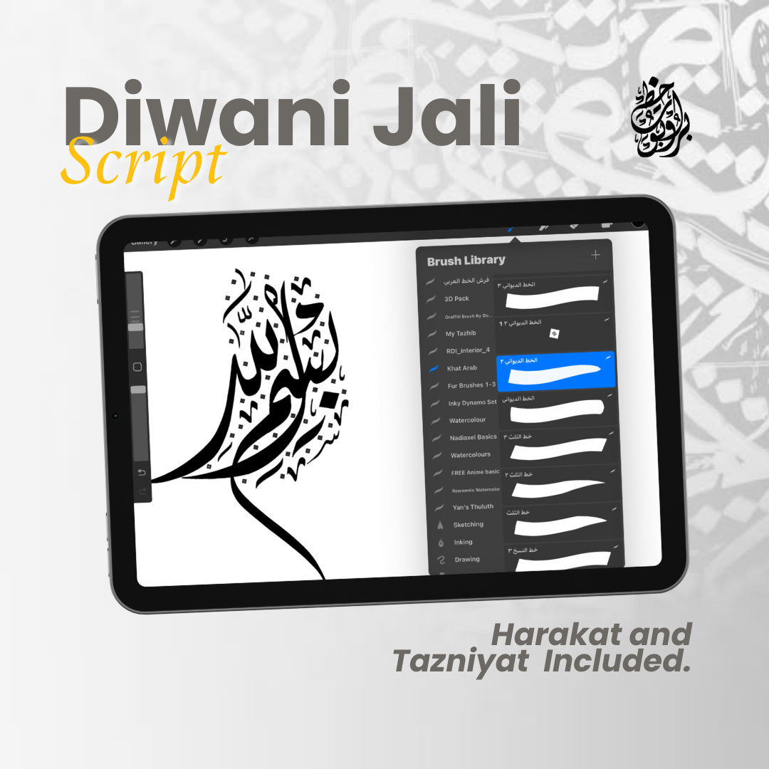 Unlock the beauty of Arabic calligraphy with this premium Procreate brush set, featuring 6 essential scripts: Thuluth, Naskh, Diwani Jali, Diwani, Riq’ah, and Farisi (Nasta’liq). Designed for both beginners and professionals, this set includes 80+ high-quality brushes, guideline brushes, and decorative flourishes to elevate your artwork.