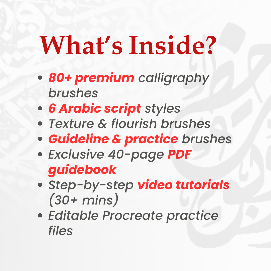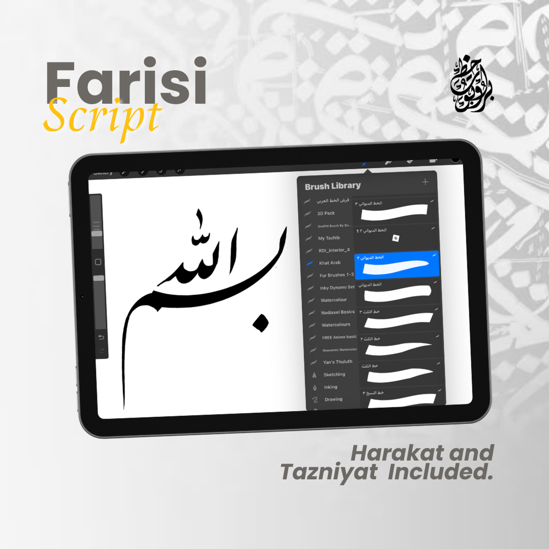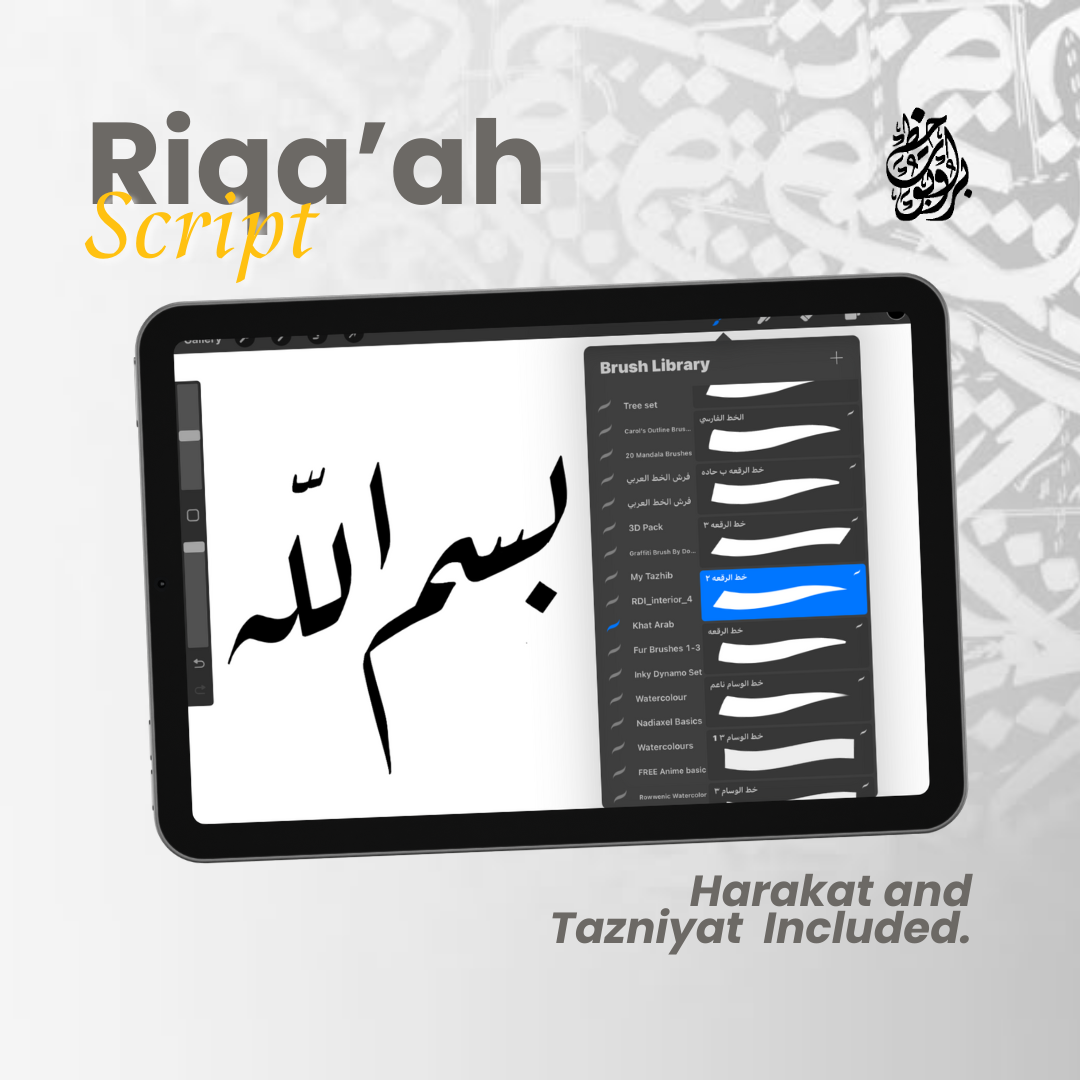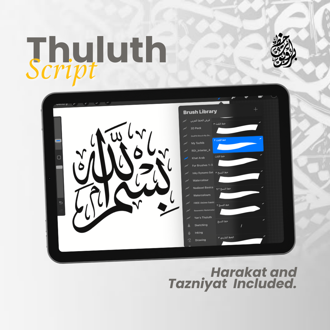 Unlock the beauty of Arabic calligraphy with this premium Procreate brush set, featuring 6 essential scripts: Thuluth, Naskh, Diwani Jali, Diwani, Riq’ah, and Farisi (Nasta’liq). Designed for both beginners and professionals, this set includes 80+ high-quality brushes, guideline brushes, and decorative flourishes to elevate your artwork.